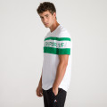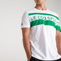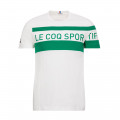 Maglietta a maniche corte con collo rotondo, fondo bianco con inserti corporativi verdi nella parte anteriroe. Il prodotto è fabbricato in Marocco, rifinito in Francia in cotone da 140g. Il taglio è Regular Fit, piacevole da indossare. Scritta "Le Coq Sportif" stampata, logo Le Coq ricamato.